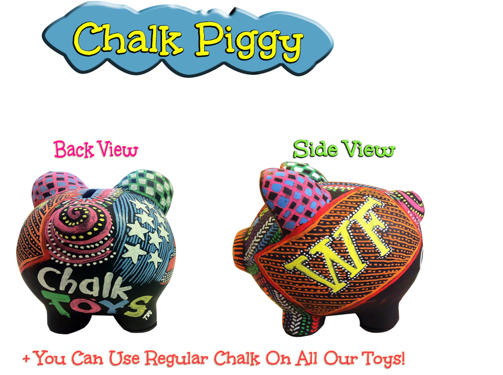 Teaching a child to save his money is an important lesson for a child to learn….but when the child has a Chalk Piggy bank, he or she will enjoy placing his pennies, dimes, and nickels in his or her own personalized piggy bank. It might be a Mr. Piggy bank with big stripes and a moustache or maybe it is a Mrs. Piggy bank with pink flowers and bows and big bright eyes. Mr. or Mrs. Piggy bank can be changed to be a soldier's piggy bank by just washing it and decorating it with camouflage…..Chalk Piggy can be anything that the little 'banker' wants his or her piggy bank to be.